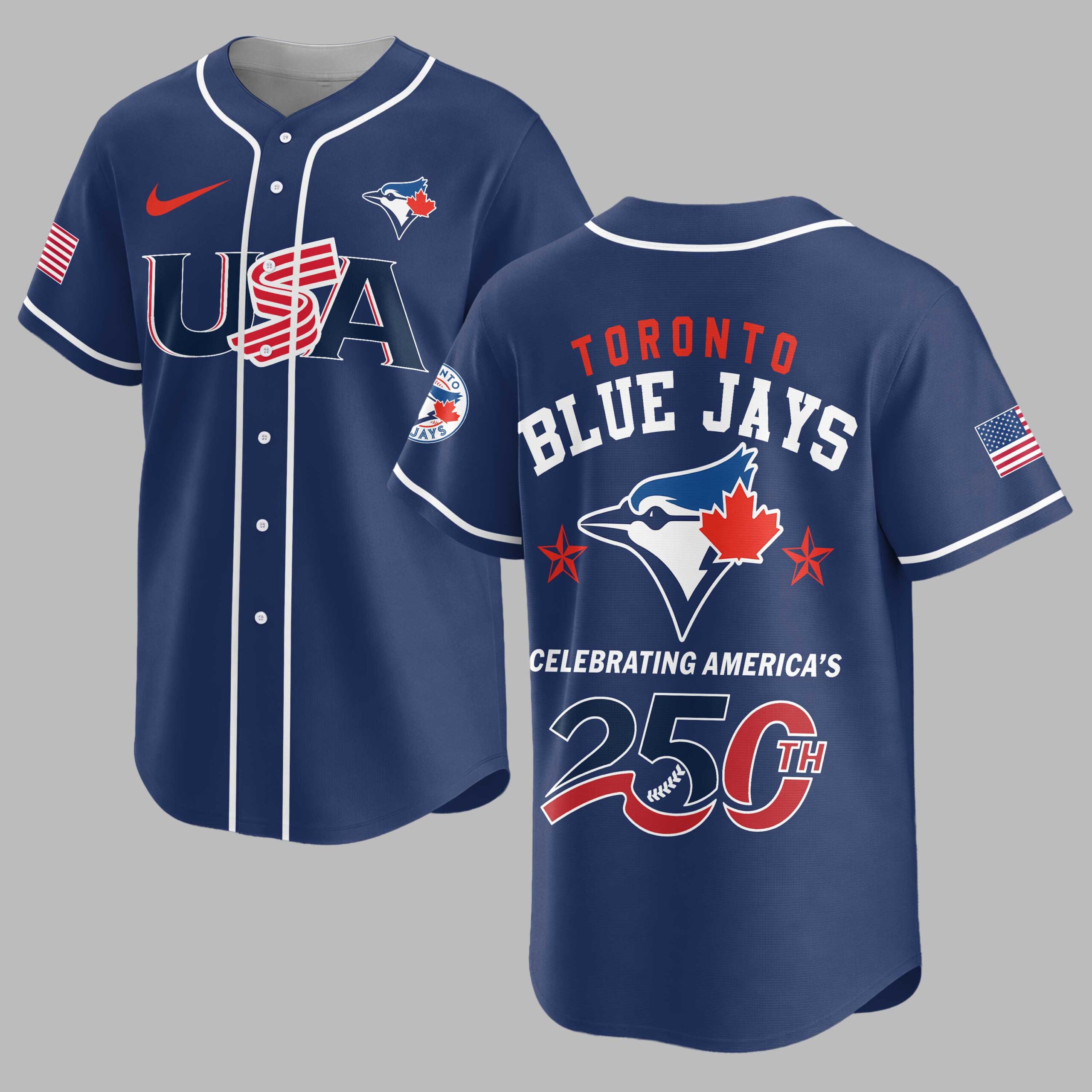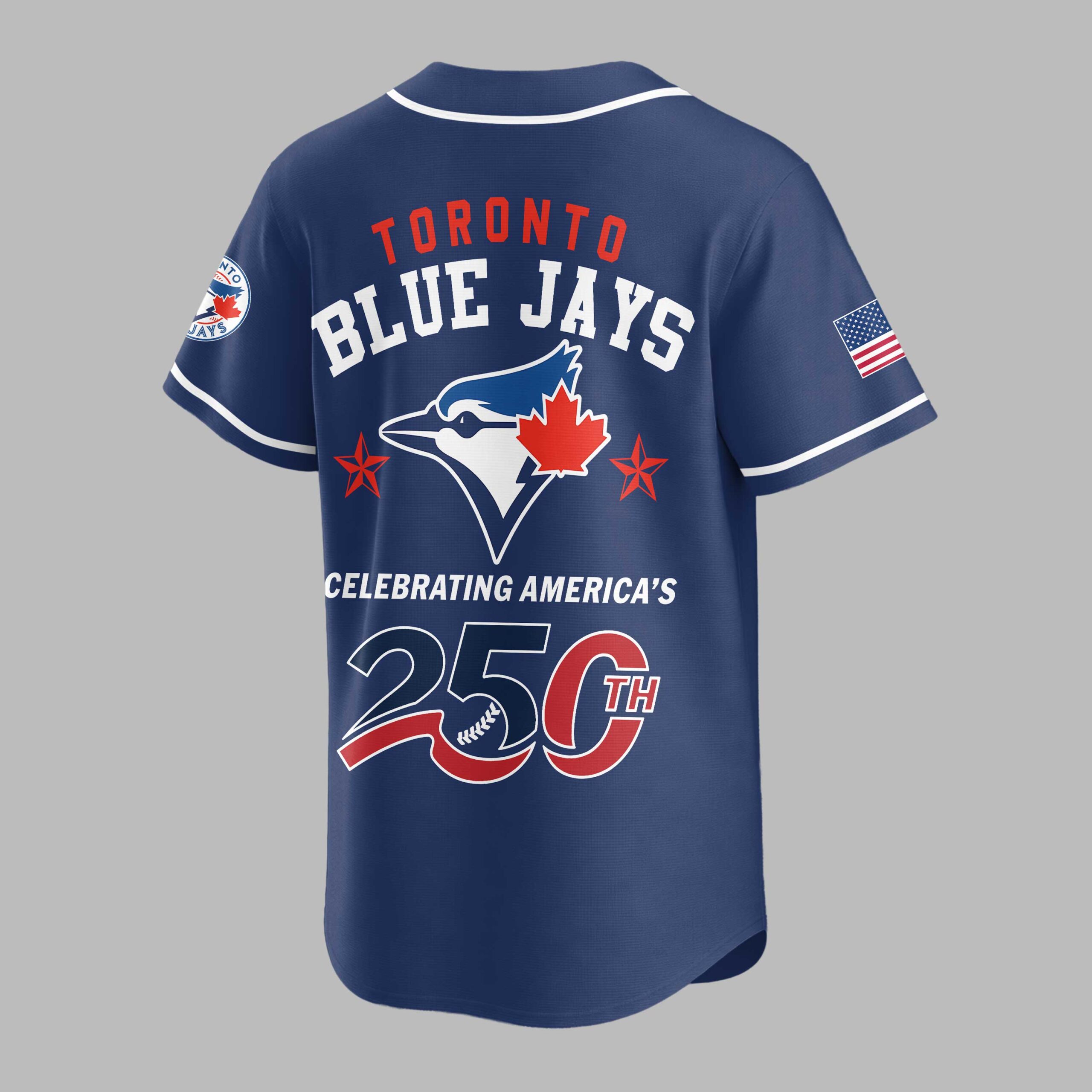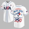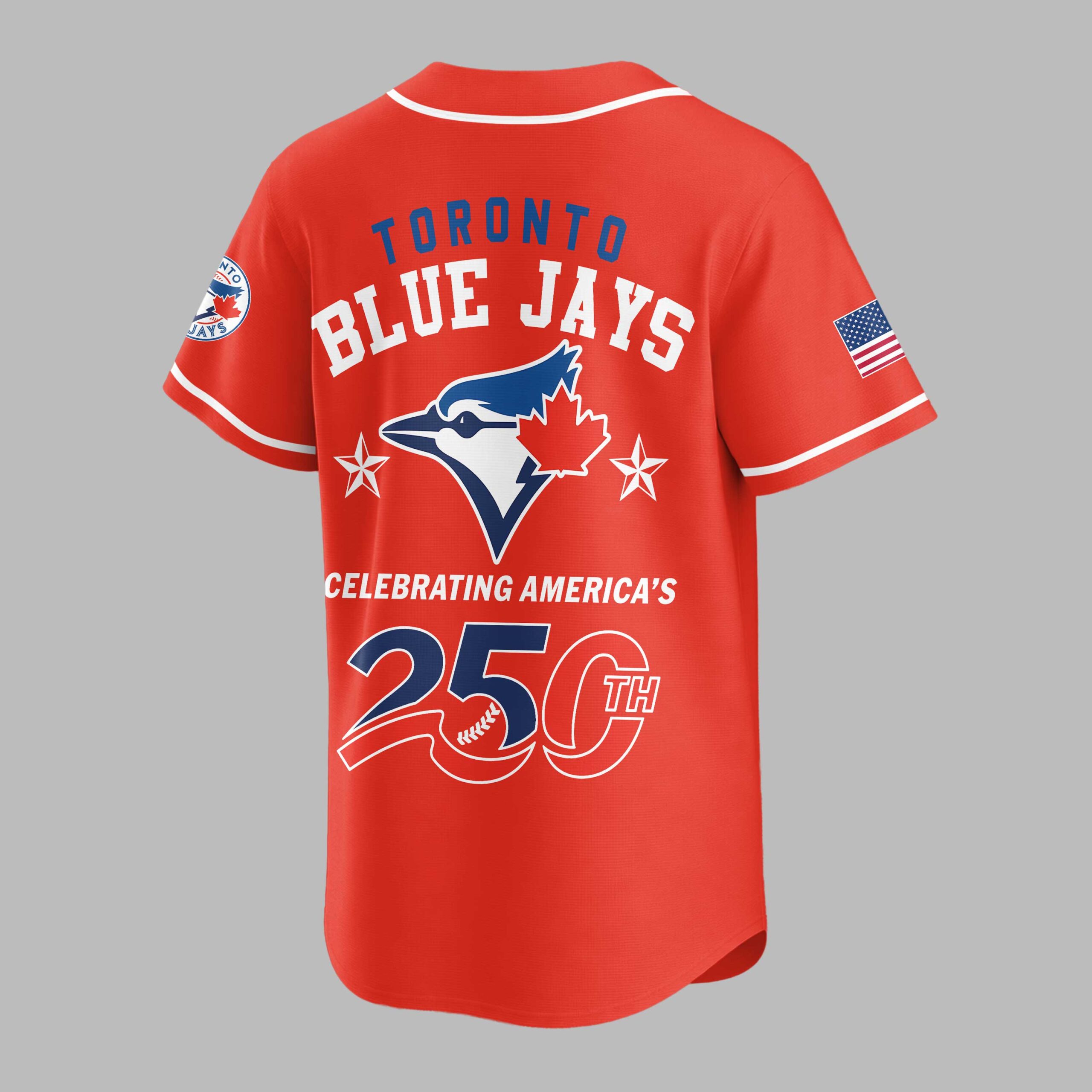 Show your unwavering support for the Toronto Blue Jays while celebrating a monumental American milestone! This patriotic baseball jersey is a vibrant tribute to both your favorite team and America’s 250th anniversary, blending sports enthusiasm with national pride in a truly unique design. The white front proudly features USA in bold red and blue, with flag-inspired stripes, alongside the Toronto Blue Jays logo on the left sleeve. The back showcases TORONTO BLUE JAYS above a dynamic blue jay emblem, accented by stars. CELEBRATING AMERICA’S 250TH is prominently displayed with a baseball-stitched 250TH, and American flags adorn both sleeves. Perfect for game days, national holidays, or any event where you want to showcase your passion for baseball and country. This jersey lets you honor your team and America’s rich history, making it an essential piece for any Blue Jays fan who loves to celebrate in style.