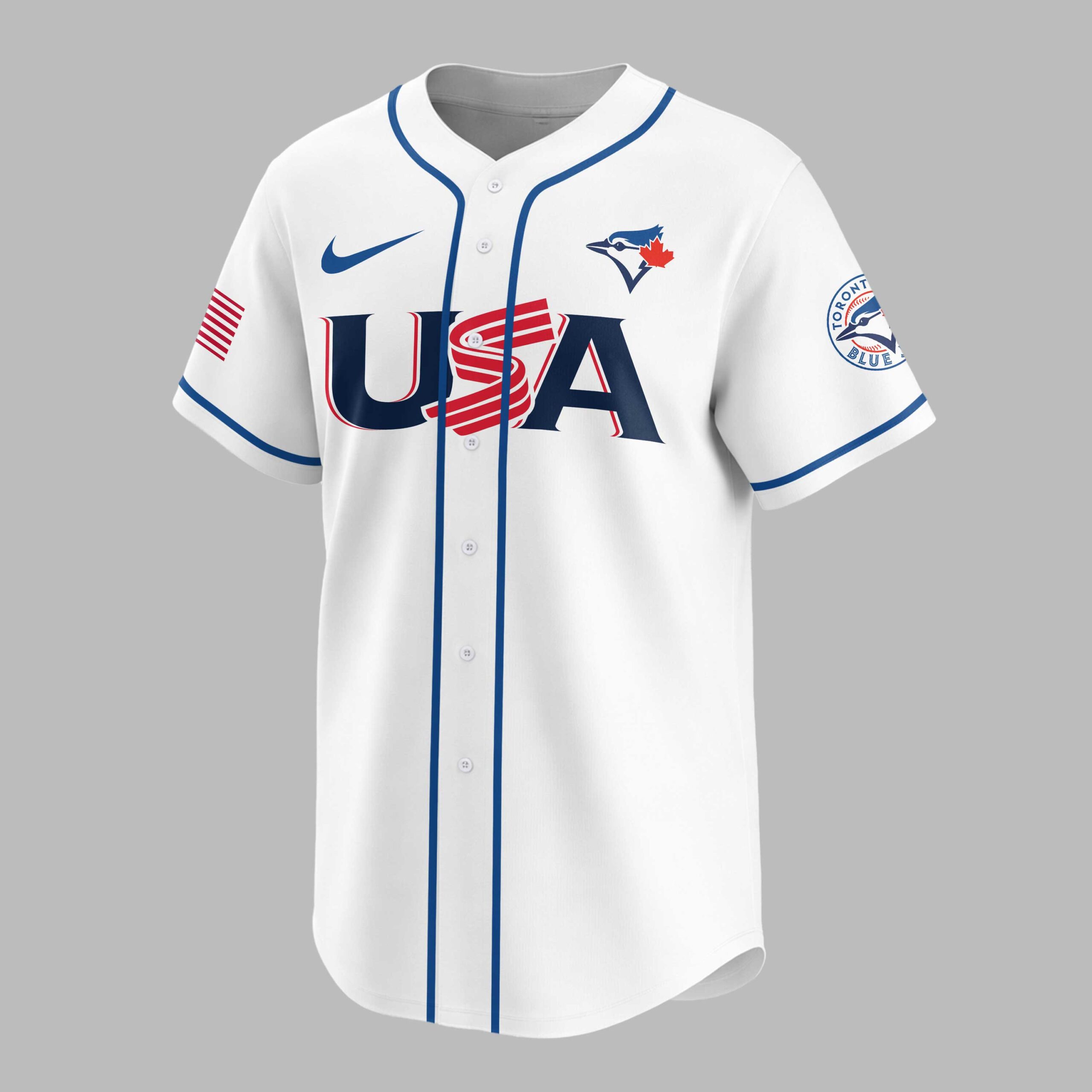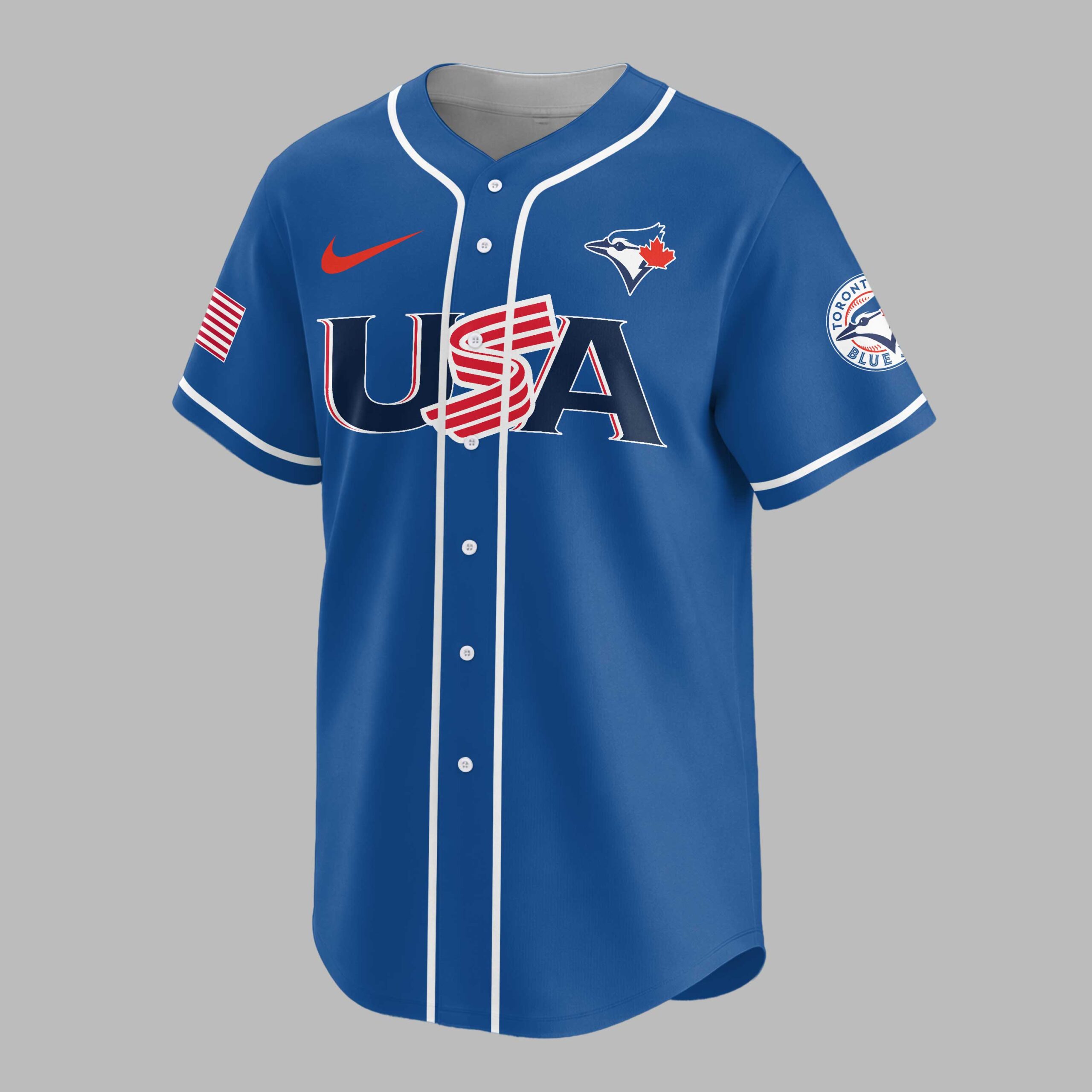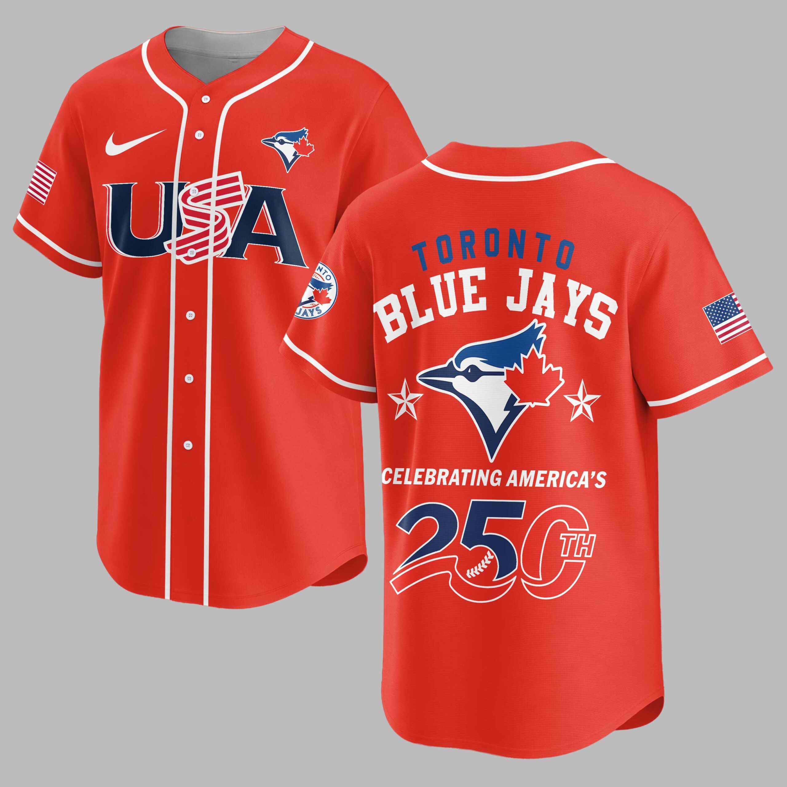 Show your unwavering support for the Toronto Blue Jays while celebrating a monumental American milestone! This patriotic baseball jersey is a vibrant tribute to both your favorite team and America’s 250th anniversary, blending sports enthusiasm with national pride in a truly unique design. The white front proudly features USA in bold red and blue, with flag-inspired stripes, alongside the Toronto Blue Jays logo on the left sleeve. The back showcases TORONTO BLUE JAYS above a dynamic blue jay emblem, accented by stars. CELEBRATING AMERICA’S 250TH is prominently displayed with a baseball-stitched 250TH, and American flags adorn both sleeves. Perfect for game days, national holidays, or any event where you want to showcase your passion for baseball and country. This jersey lets you honor your team and America’s rich history, making it an essential piece for any Blue Jays fan who loves to celebrate in style.