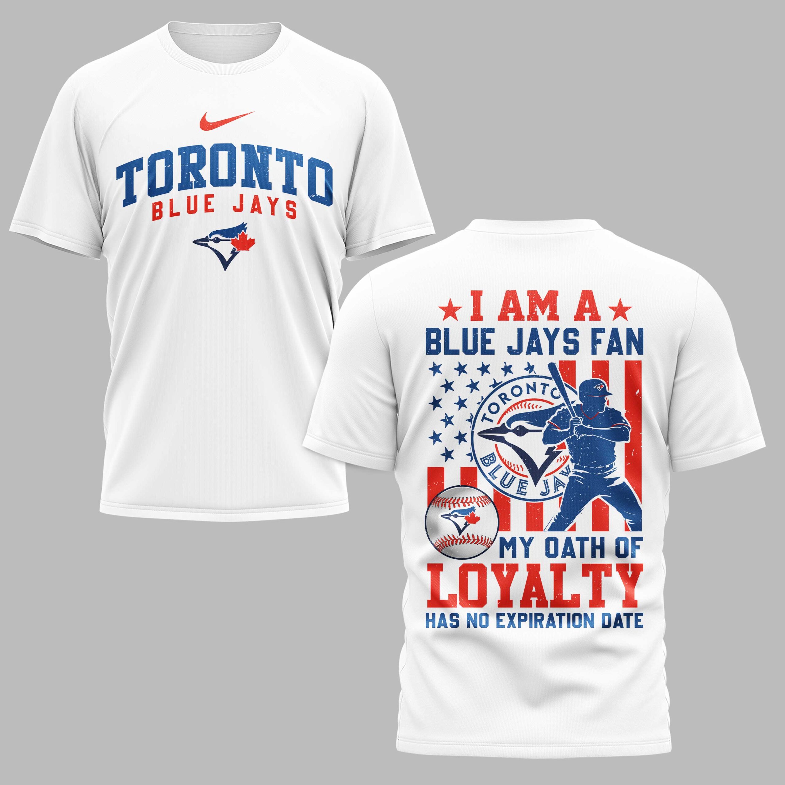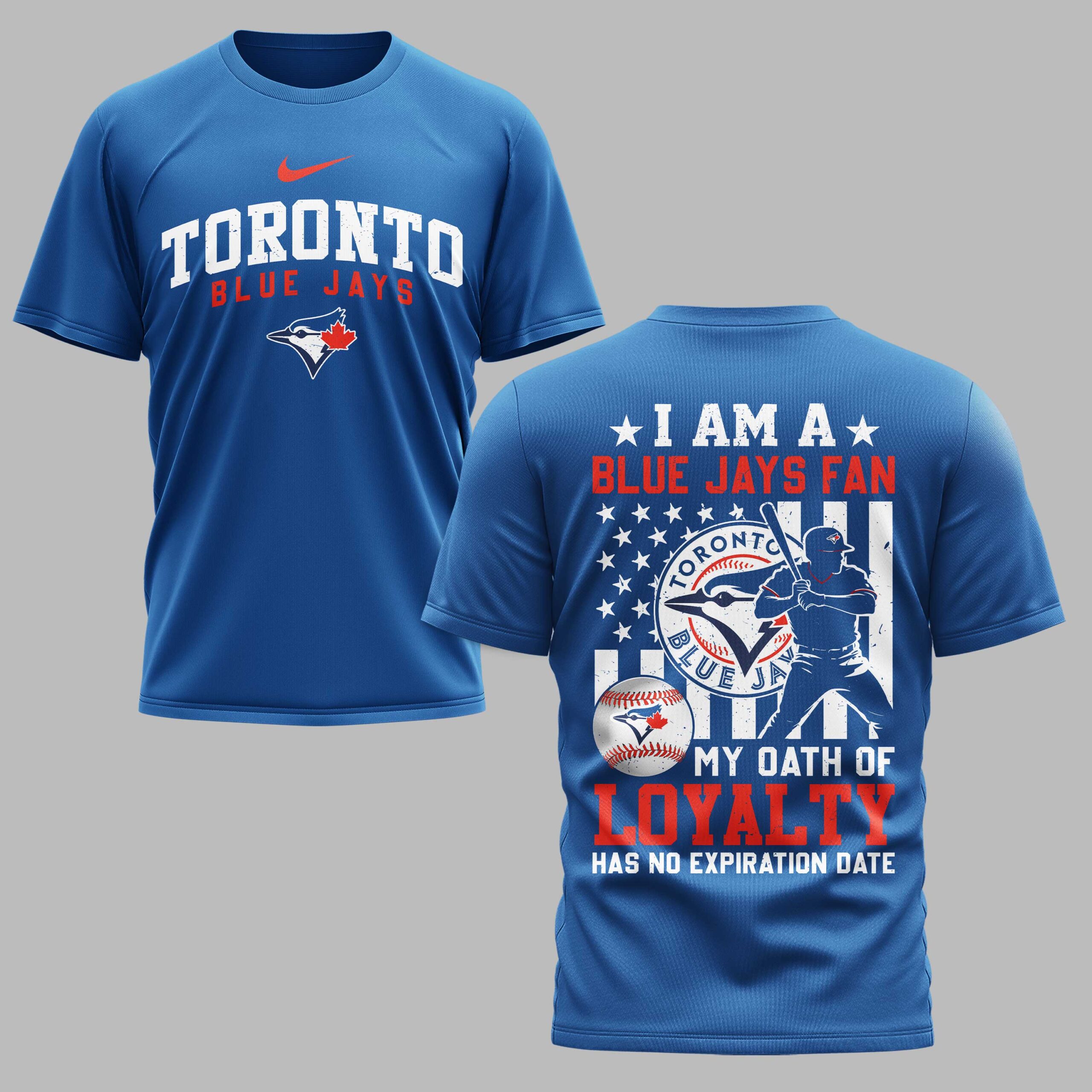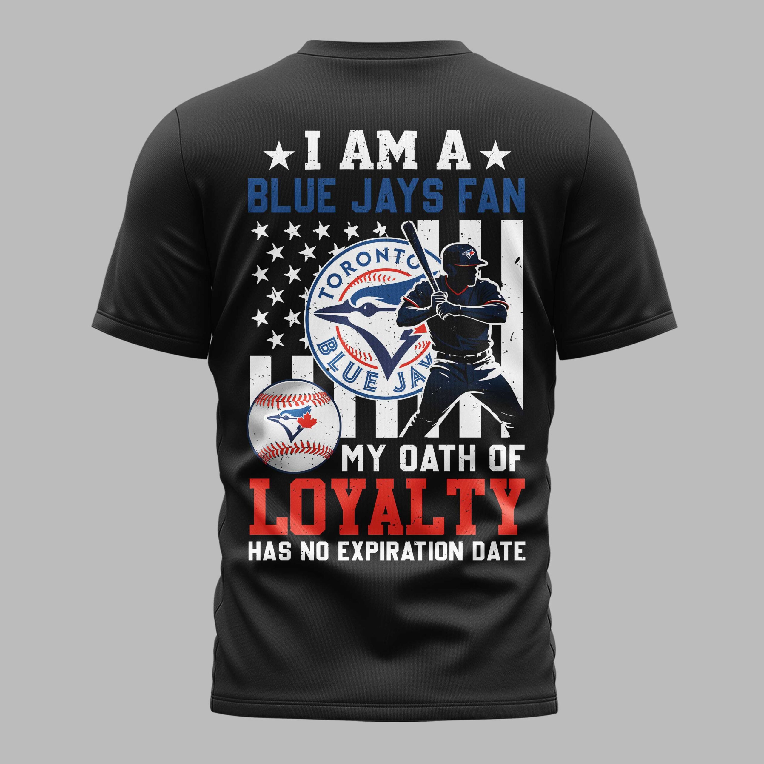 Showcase your unwavering team spirit and celebrate the historic American spirit with this bold Toronto Blue Jays tribute. This shirt is designed for dedicated fans who carry their loyalty with them everywhere, blending a love for the diamond with a patriotic salute to Independence. It is the ultimate statement piece for any die-hard fan who knows that true team pride knows no borders. The front of the shirt features the iconic Toronto Blue Jays name and bird logo prominently displayed in vibrant team colors. Turn it around to reveal a powerful back graphic that combines a classic American flag motif with the declaration, I AM A BLUE JAYS FAN and MY OATH OF LOYALTY HAS NO EXPIRATION DATE. Complete with a batter silhouette and a team-branded baseball, the design captures the energy of the game. Whether you are heading to the ballpark for a summer double-header, hosting an Independence Day BBQ, or just representing your team around town, this tee is built for every fan moment. Wear it with pride on game day or as a standout addition to your everyday fan gear collection.