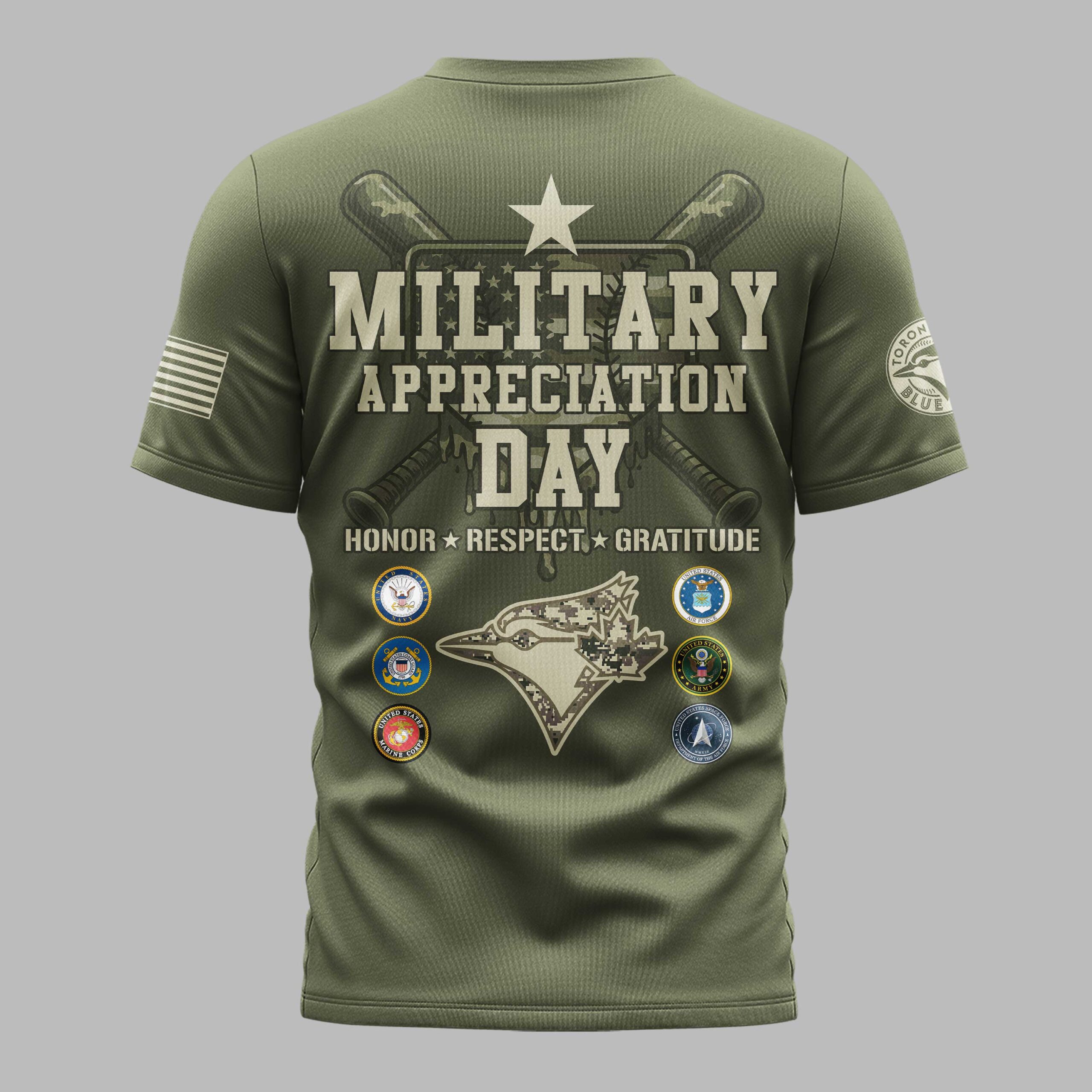 Show your Toronto Blue Jays pride and honor our nation’s heroes with this special Military Appreciation Day T-shirt. This design blends your passion for baseball with a deep respect for the brave men and women of the U.S. Armed Forces. The front features ‘TORONTO BLUE JAYS,’ with ‘TORONTO’ in a distinct camouflage pattern, and an American flag on the sleeve. The back boldly proclaims ‘MILITARY APPRECIATION DAY’ in star-spangled text, highlighted by crossed baseball bats and a star. Below, ‘HONOR * RESPECT * GRATITUDE’ is surrounded by the official seals of all six U.S. military branches and a camouflage Blue Jays logo. Perfect for game days, military holidays, or any patriotic event, this shirt lets you cheer on the Blue Jays and express profound gratitude. Wear it proudly to show your dual loyalty and appreciation.