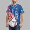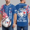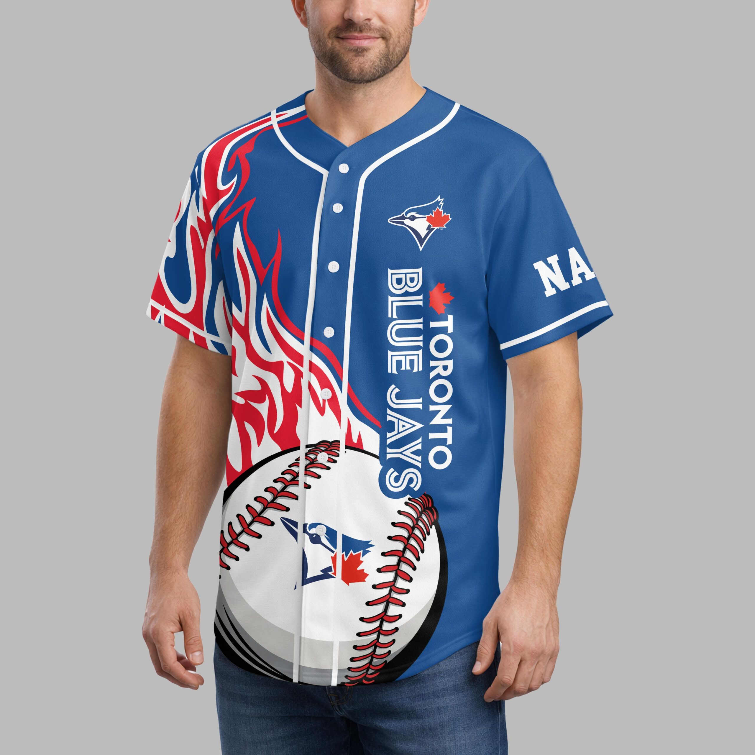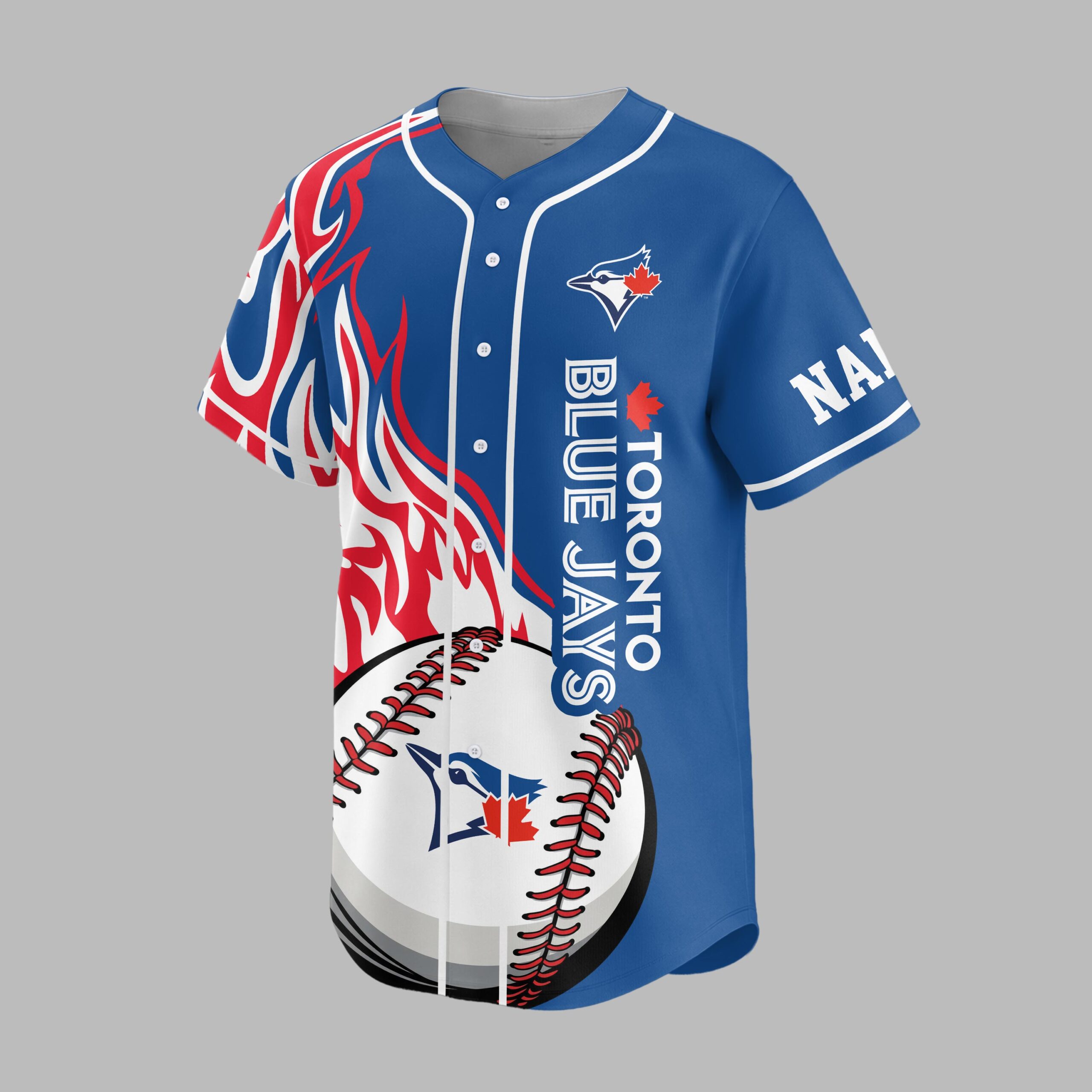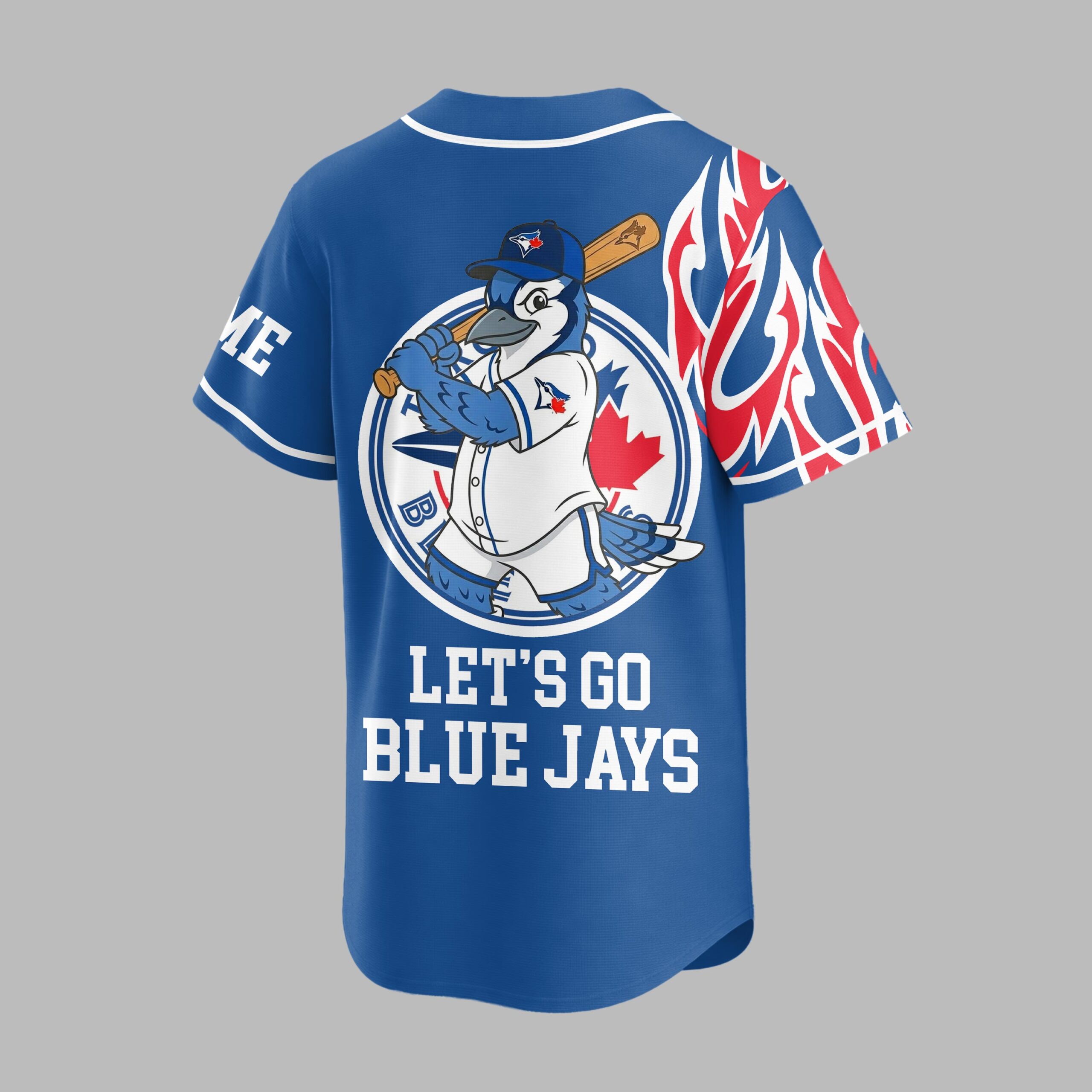 Ignite your game day spirit with this electrifying Toronto Blue Jays fan jersey! Perfect for dedicated supporters, it’s the ultimate way to boldly display your team pride and cheer on your Blue Jays through every thrilling moment. The jersey’s front features bold red and white flame graphics across the shoulders, alongside a striking baseball design and vertical TORONTO BLUE JAYS lettering. The iconic team logo proudly sits on the chest. On the back, an energetic cartoon Blue Jay mascot, bat in hand, is showcased within a circular emblem, highlighted by the powerful LET’S GO BLUE JAYS rallying cry. Wear this vibrant jersey to the stadium, watch parties, or just around town. It’s a statement of unwavering loyalty and passion for your favorite team.