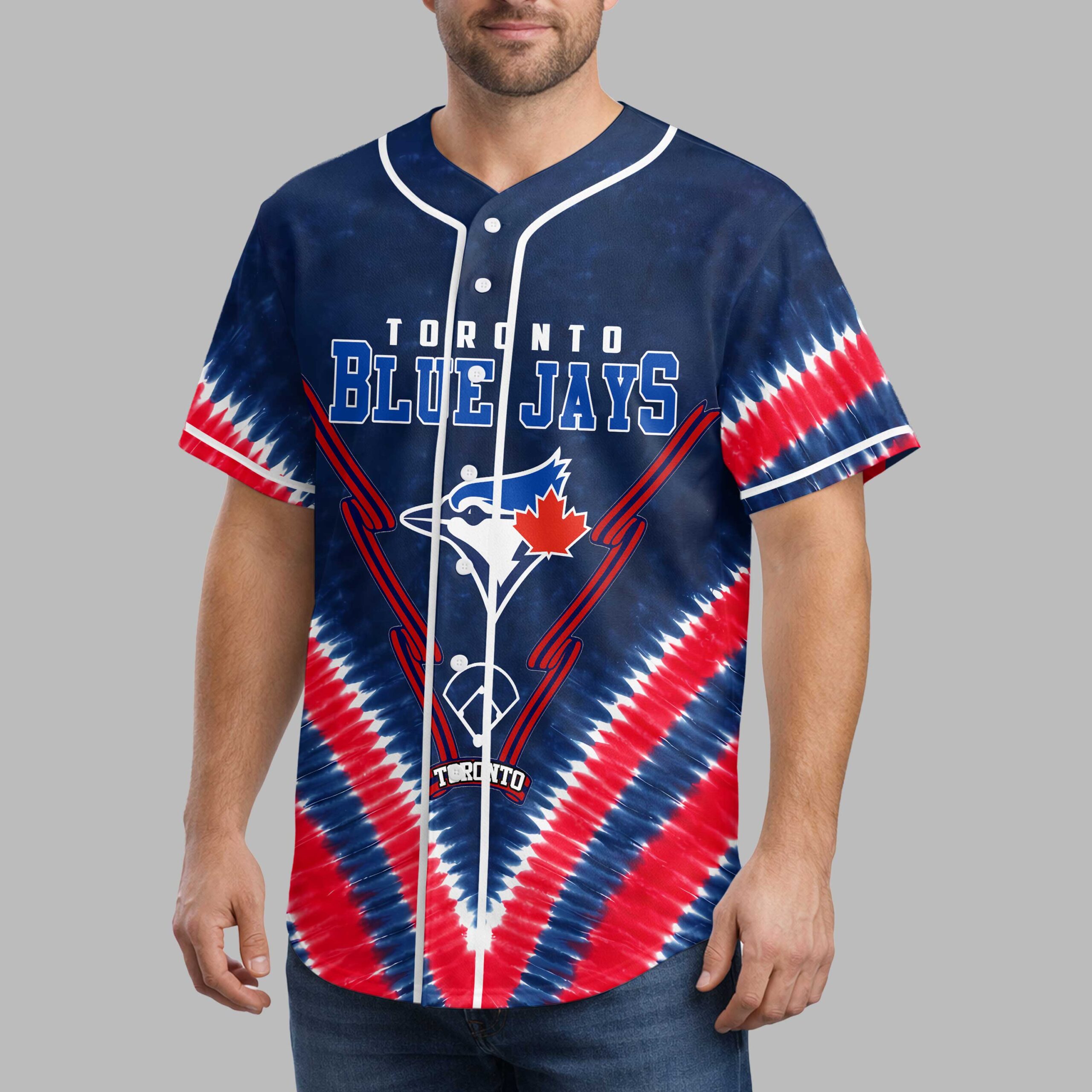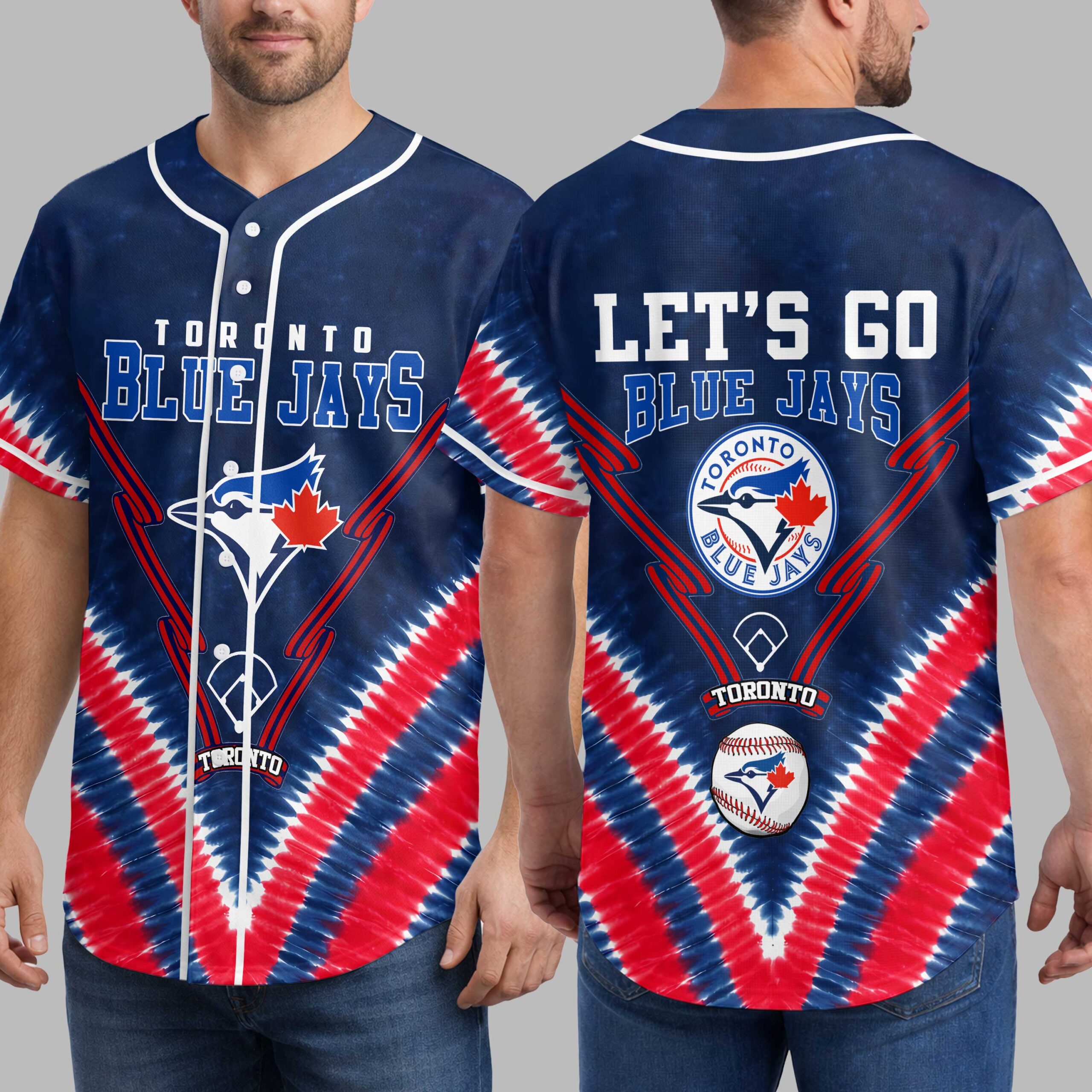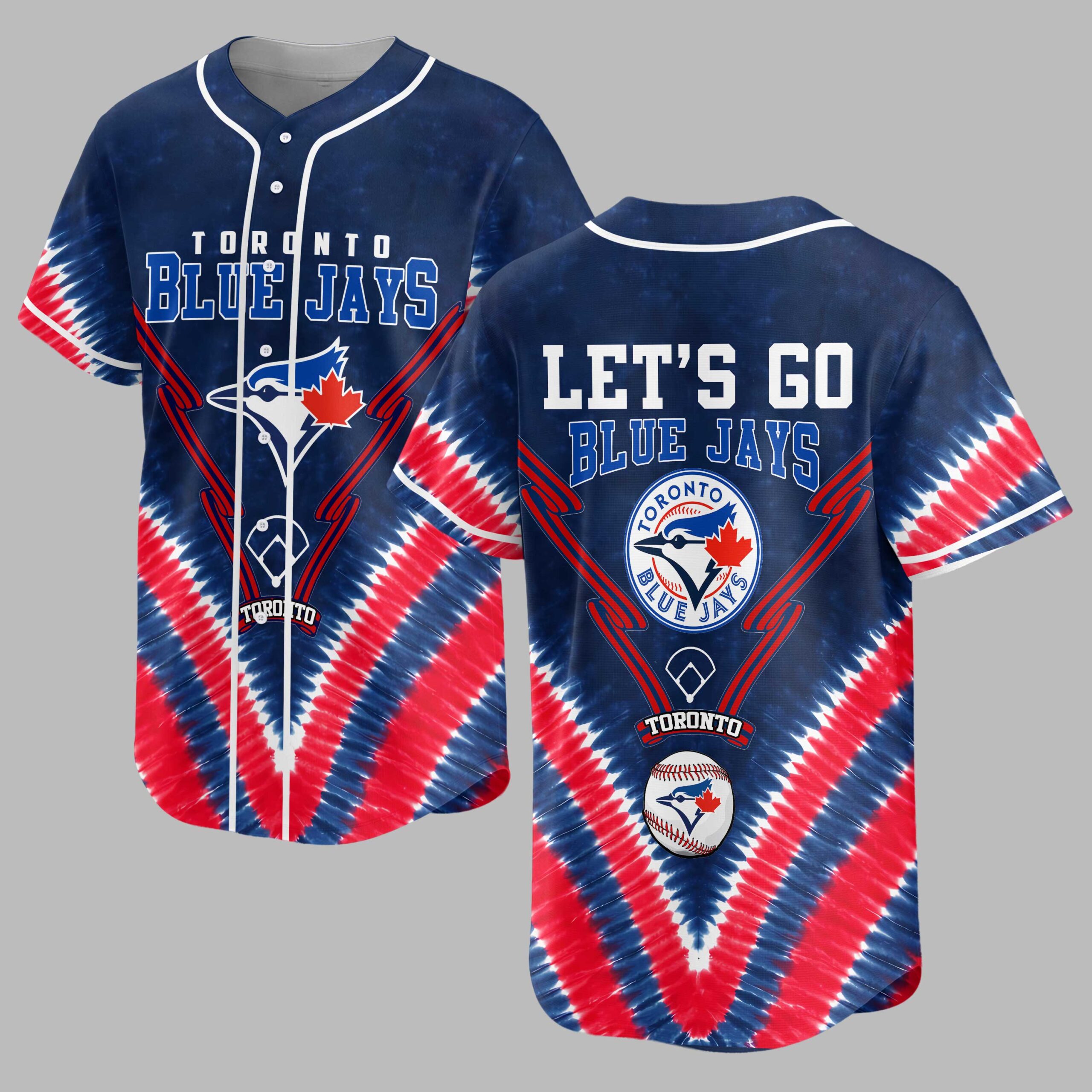 Showcase your ultimate team spirit with this vibrant Toronto Blue Jays Tie-Dye Baseball Jersey! Perfect for every devoted fan, this energetic shirt lets you proudly display your passion for the Jays in bold Canadian style. The front highlights TORONTO BLUE JAYS text with the iconic bird logo and a red maple leaf, while the back rallies support with LET’S GO BLUE JAYS and a prominent circular team logo. Both sides are framed by a striking red, white, and blue tie-dye pattern, adding a patriotic flair to your game day look. Wear this jersey to the ballpark, a watch party, or any casual outing. It’s ideal for sunny afternoons at the stadium or simply representing your unwavering pride for the Toronto Blue Jays wherever you go.