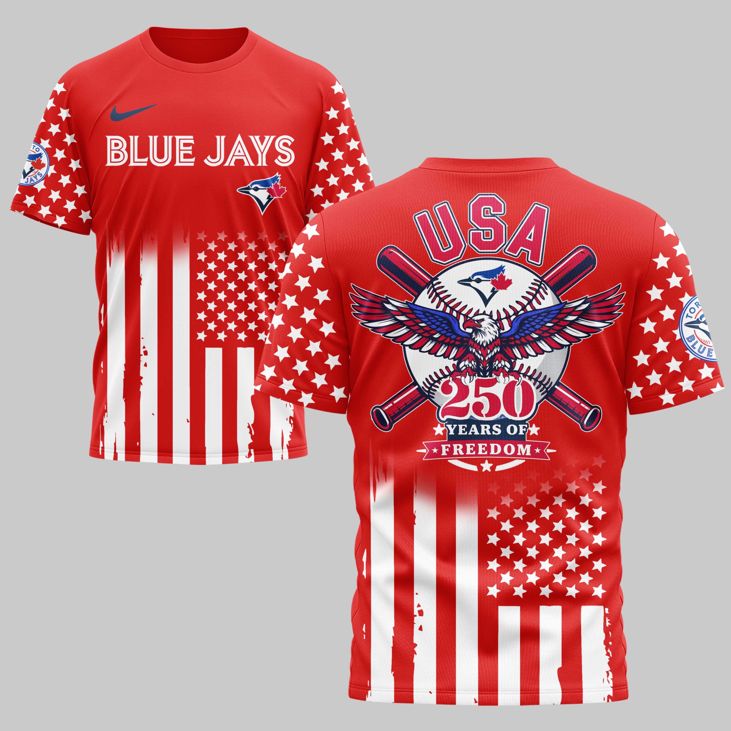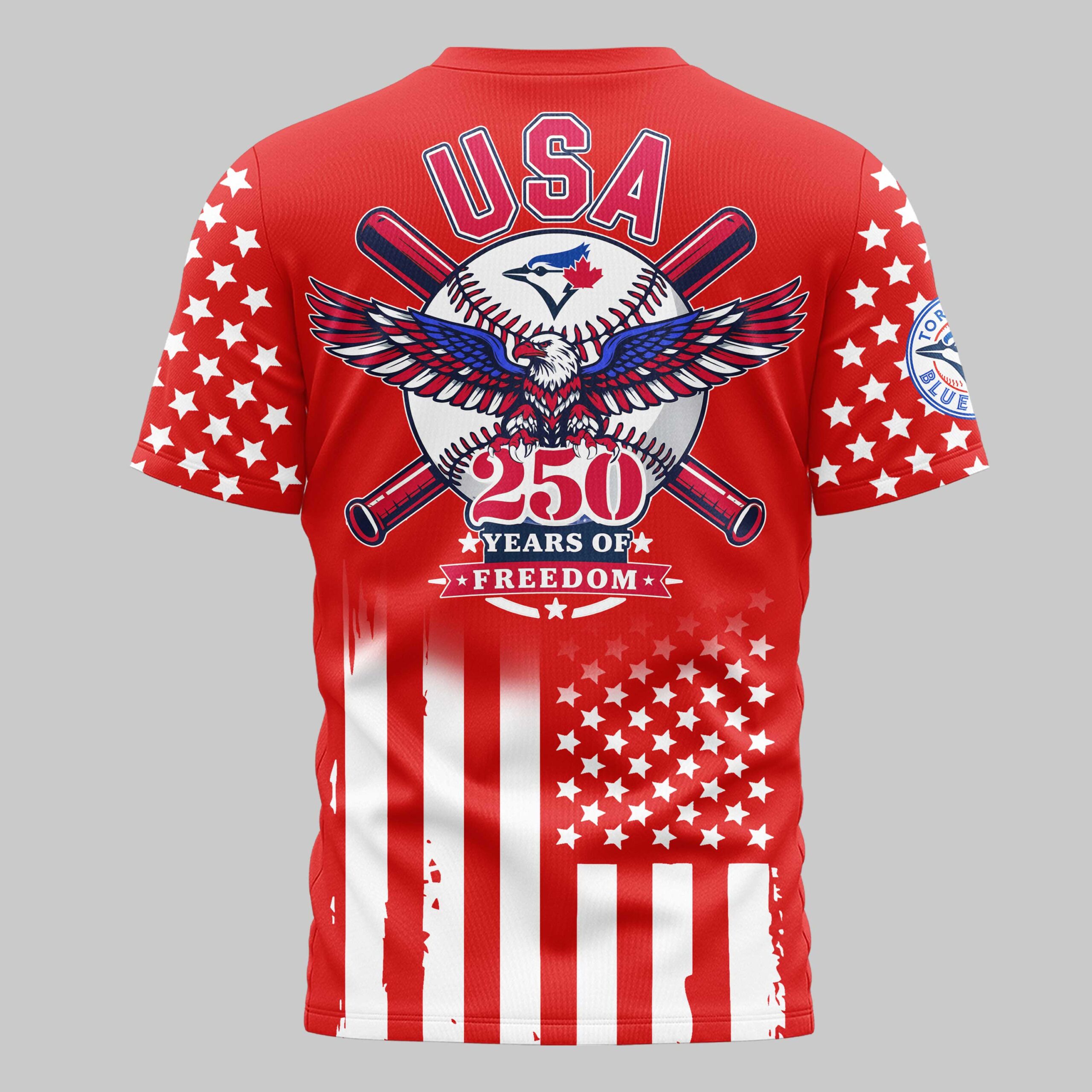 Celebrate a historic milestone and your love for the game with this Blue Jays USA 250 Independence Baseball Fan T-Shirt. This unique piece blends deep-rooted team spirit with a bold patriotic tribute, making it a standout addition to any dedicated fan’s wardrobe. It honors the 250th anniversary of freedom with a design that is as spirited as a bottom-of-the-ninth rally. The front features the bold BLUE JAYS wordmark and team logo set against a striking backdrop of stars and stripes. The sleeves are decked out in a classic star pattern, while the back showcases a stunning graphic. A majestic bald eagle with outstretched wings sits atop a large baseball and crossed bats, framed by the USA title and 250 Years of Freedom banner, creating a powerful visual statement of pride. Whether you’re heading to the ballpark, hosting an Independence Day barbecue, or just hanging out with friends, this shirt is built for game day and beyond. It’s the perfect way to show your colors and celebrate the nation’s history while cheering on your favorite team all season long.