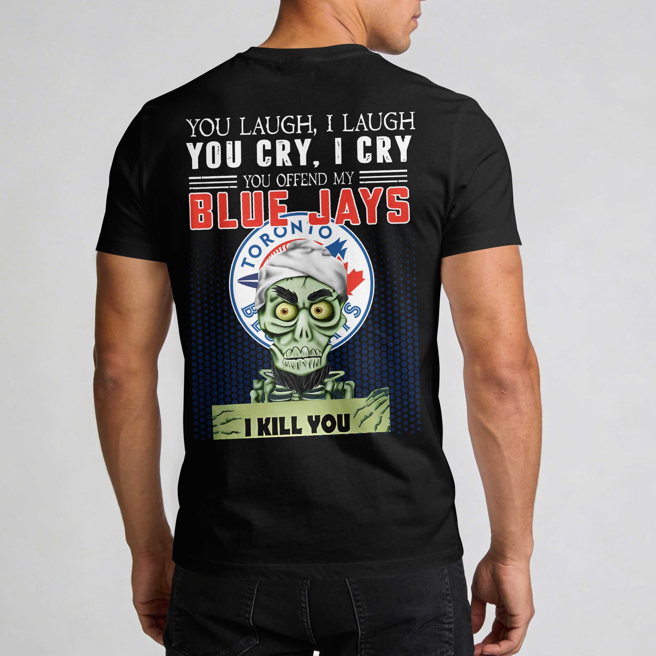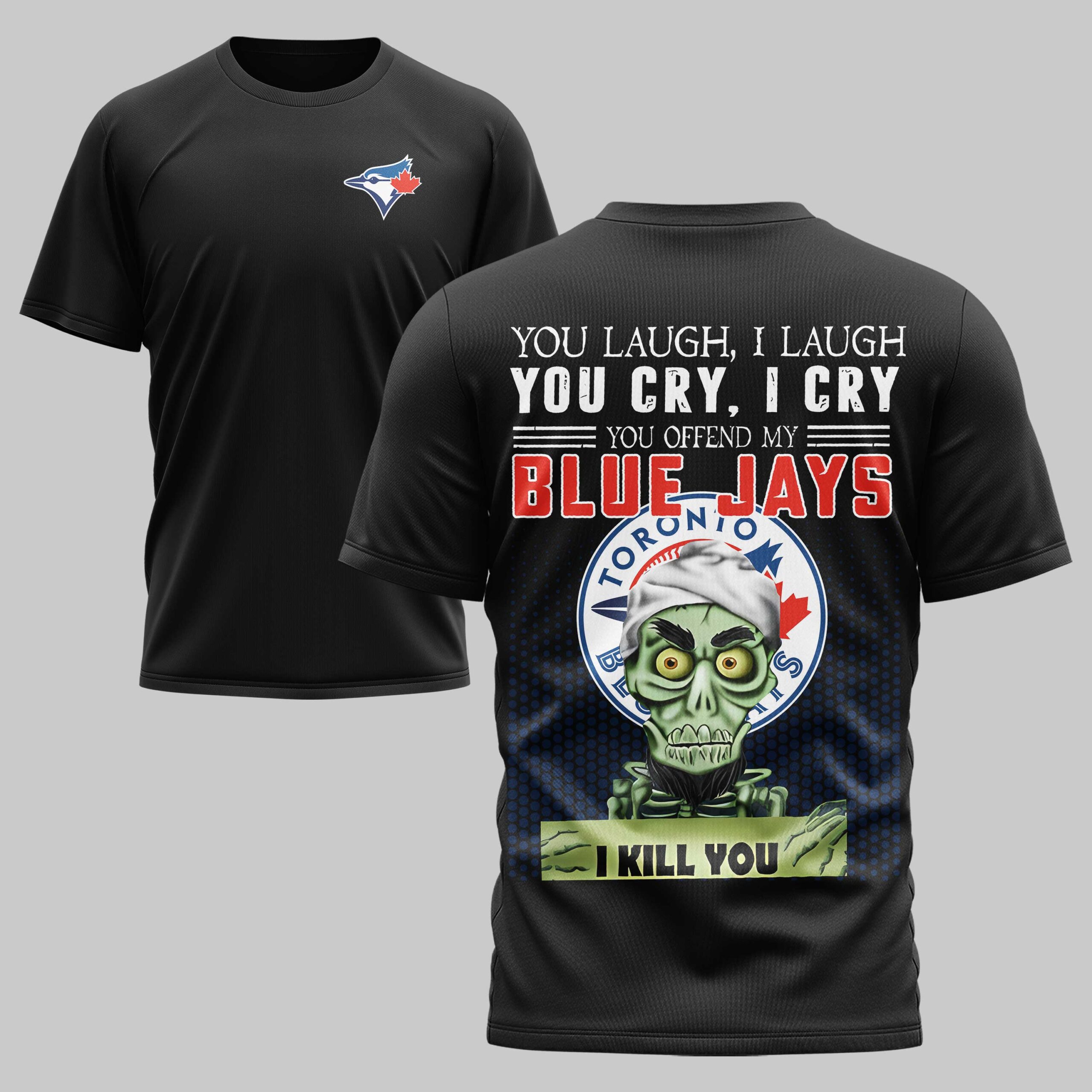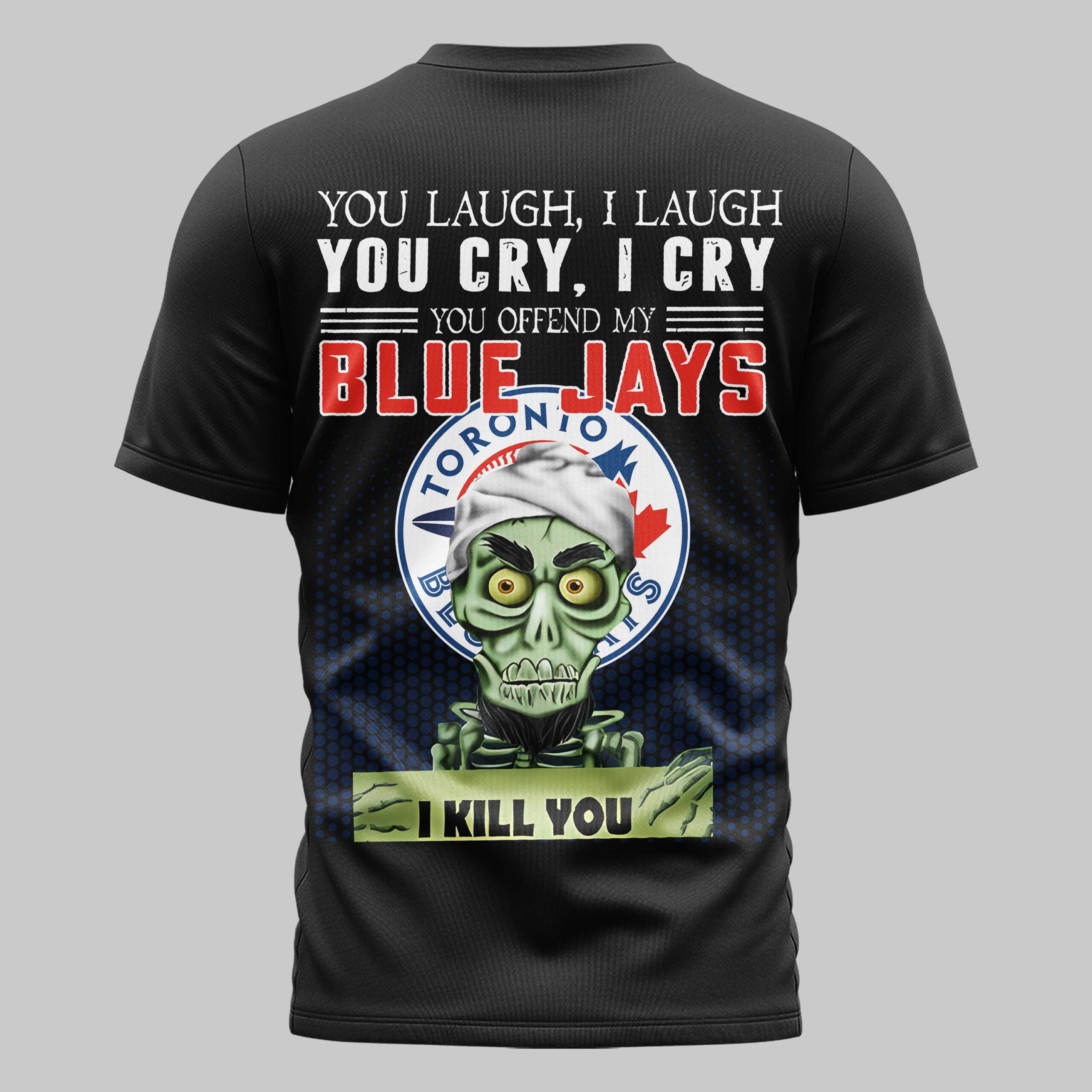 Declare your fierce Toronto Blue Jays loyalty with this bold and humorous fan tee! Designed for the ultimate baseball enthusiast, this shirt lets you express unwavering team spirit with an unforgettable edge. It’s the perfect way to showcase your passion and stand out from the crowd. The front features a classic Blue Jays logo on the left chest. The back makes a powerful statement: YOU LAUGH, I LAUGH YOU CRY, I CRY YOU OFFEND MY BLUE JAYS I KILL YOU. This assertive text is displayed above a prominent Blue Jays emblem, accompanied by a quirky green skeletal figure holding a sign that emphatically reads I KILL YOU, all set against a dynamic blue patterned background. This tee is ideal for game days, watch parties, or any casual outing to proudly assert your team’s dominance and celebrate every victory with flair.