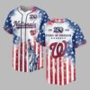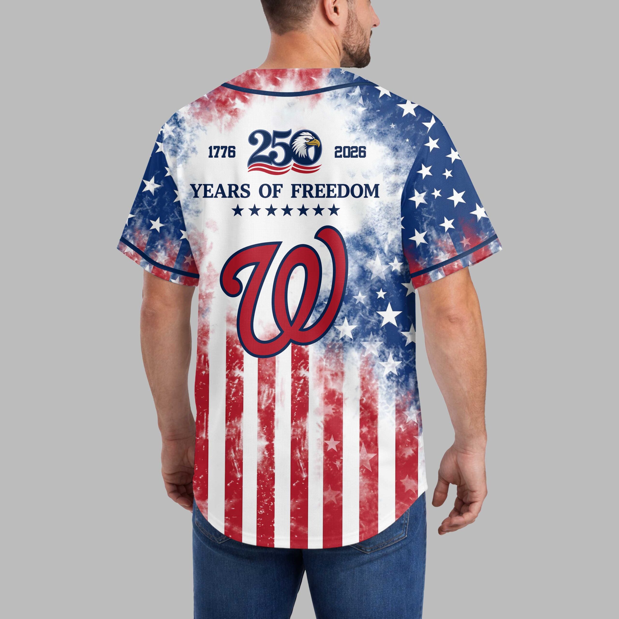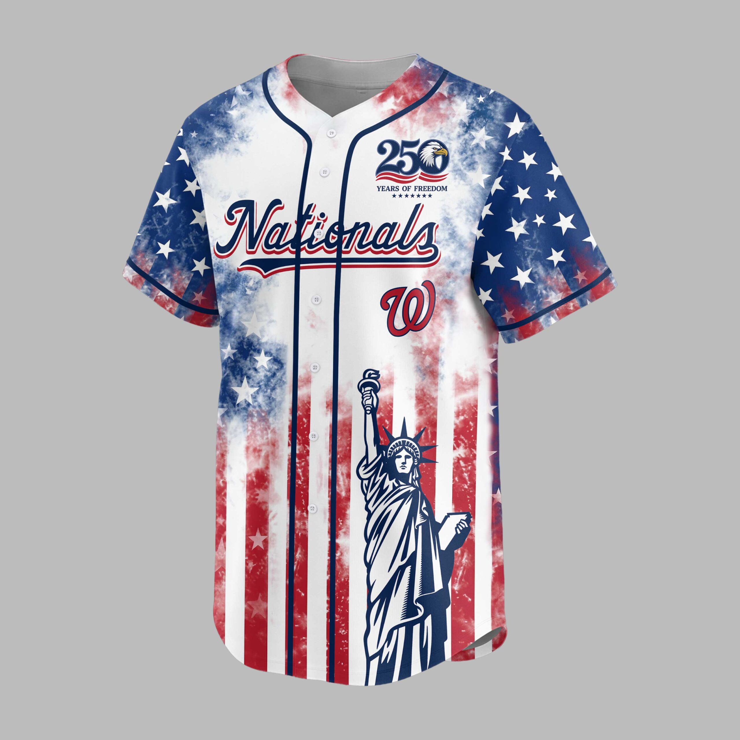 Celebrate your Washington Nationals pride and American liberty with this bold Patriotic Baseball Jersey! Commemorating ‘250 Years of Freedom,’ this unique design perfectly blends team spirit with a powerful tribute to our nation’s heritage. The front prominently features the ‘Nationals’ script, ‘W’ logo, and a majestic Statue of Liberty, alongside an eagle emblem marking ‘250 YEARS OF FREEDOM.’ The entire jersey boasts a dynamic distressed American flag design. The back displays ‘1776 250 2026 YEARS OF FREEDOM’ text and a large ‘W’ logo, making your national pride undeniable. Ideal for gamedays, Fourth of July festivities, or any patriotic event, this jersey lets you proudly showcase your Nationals fandom and American spirit. It’s a powerful statement of freedom and team pride.