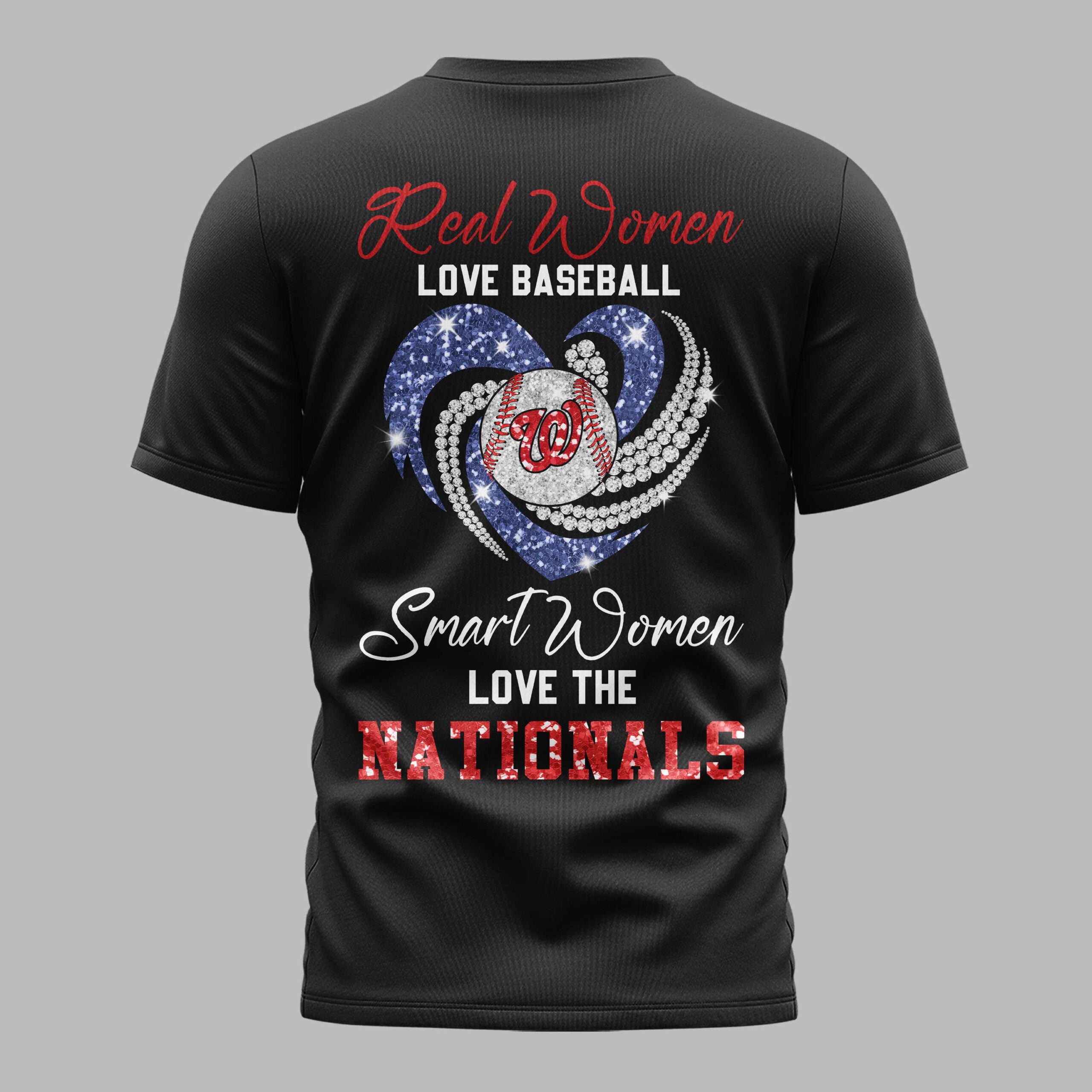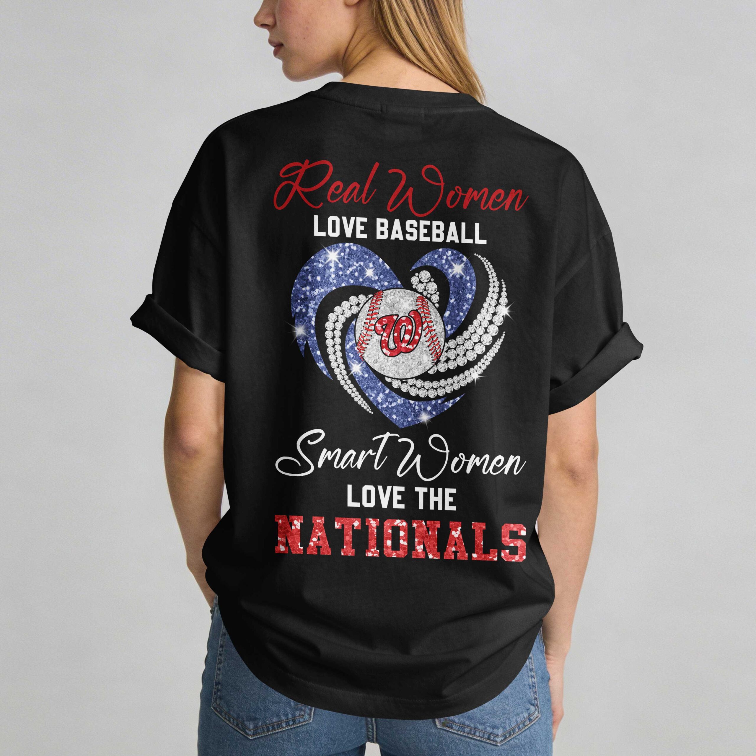 Show off your unwavering team spirit and American pride with this stunning Washington Nationals fan tee. Designed specifically for the dedicated female fan, this shirt blends your love for the national pastime with a bold patriotic flair, making it the essential addition to any Nats supporter’s game-day rotation. The front showcases the Nationals script in a vibrant red star pattern, paired with the classic curly W and a star-spangled athletic swoosh. The back makes a powerful statement: Real Women Love Baseball, Smart Women Love the Nationals. This is anchored by a dazzling heart graphic featuring a baseball, elegant pearl accents, and a blue star-filled motif that captures the team’s winning spirit. This shirt is perfect for cheering from the stands at the ballpark, attending Independence Day festivities, or representing your team during everyday outings. Celebrate the intersection of baseball and heritage with a design that stands out in any crowd.
