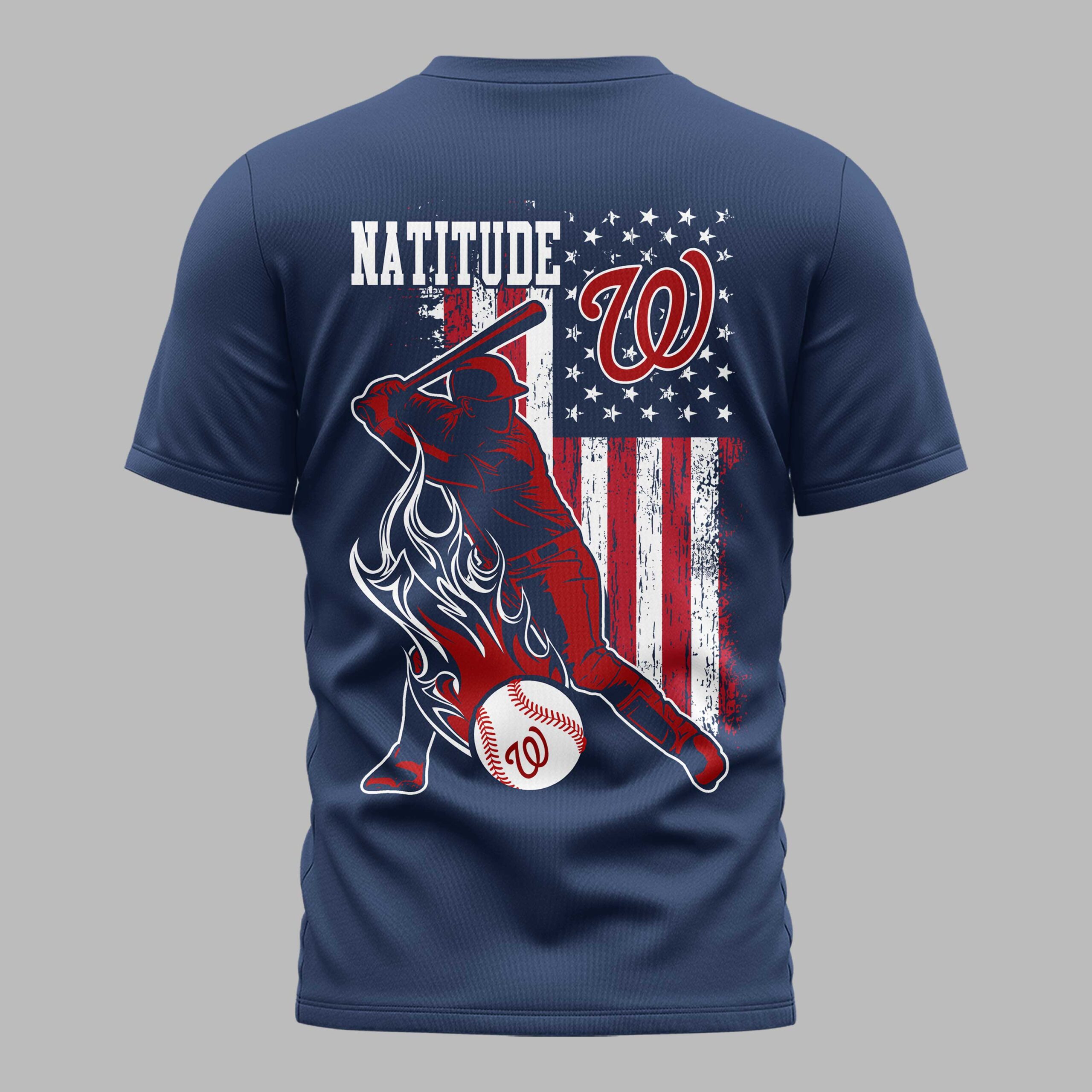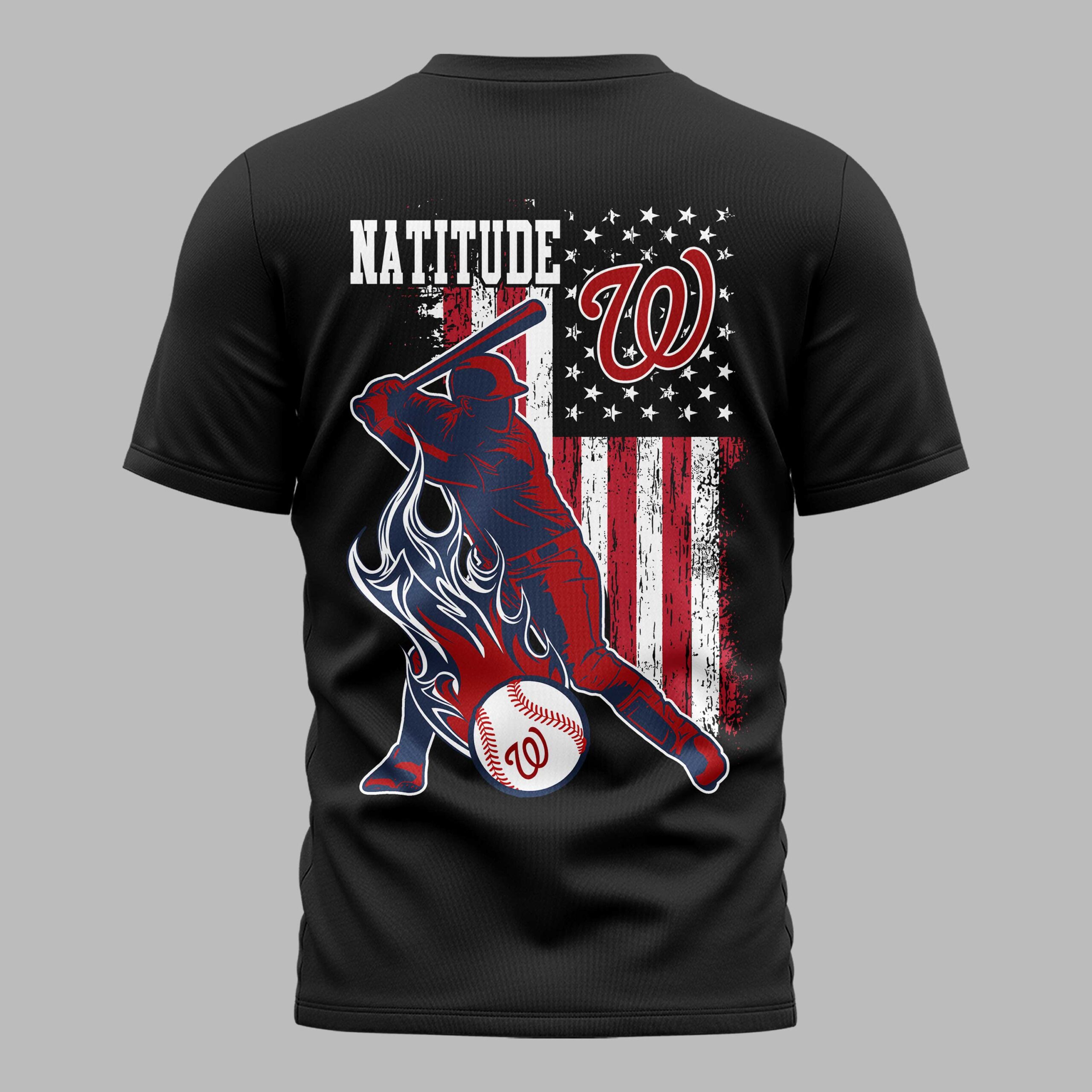 Ignite your passion for the Washington Nationals with this dynamic tee, perfect for showcasing your Natitude with pride! This shirt embodies the spirited energy of game day, blending your love for baseball with a bold, patriotic flair. Stand out from the crowd and let everyone know where your loyalties lie, celebrating every home run and stellar play. The front proudly displays WASHINGTON NATIONALS with a classic American flag, while a sleek Nike swoosh adds a touch of athletic style. The back is a true standout, featuring a striking silhouette of a batter mid-swing against a distressed American flag backdrop. White flames blaze around a baseball marked with the iconic W logo, all beneath the powerful statement NATITUDE and a larger team W emblem, creating an unforgettable design. Whether you’re cheering from the stands, gathering for a watch party, or simply out and about, this shirt is your go-to for showing unwavering Nationals support. It’s ideal for game days, casual outings, or any occasion where you want to express your team spirit and love for the nation’s capital team. Celebrate the Nationals and wear your Natitude loud and proud!