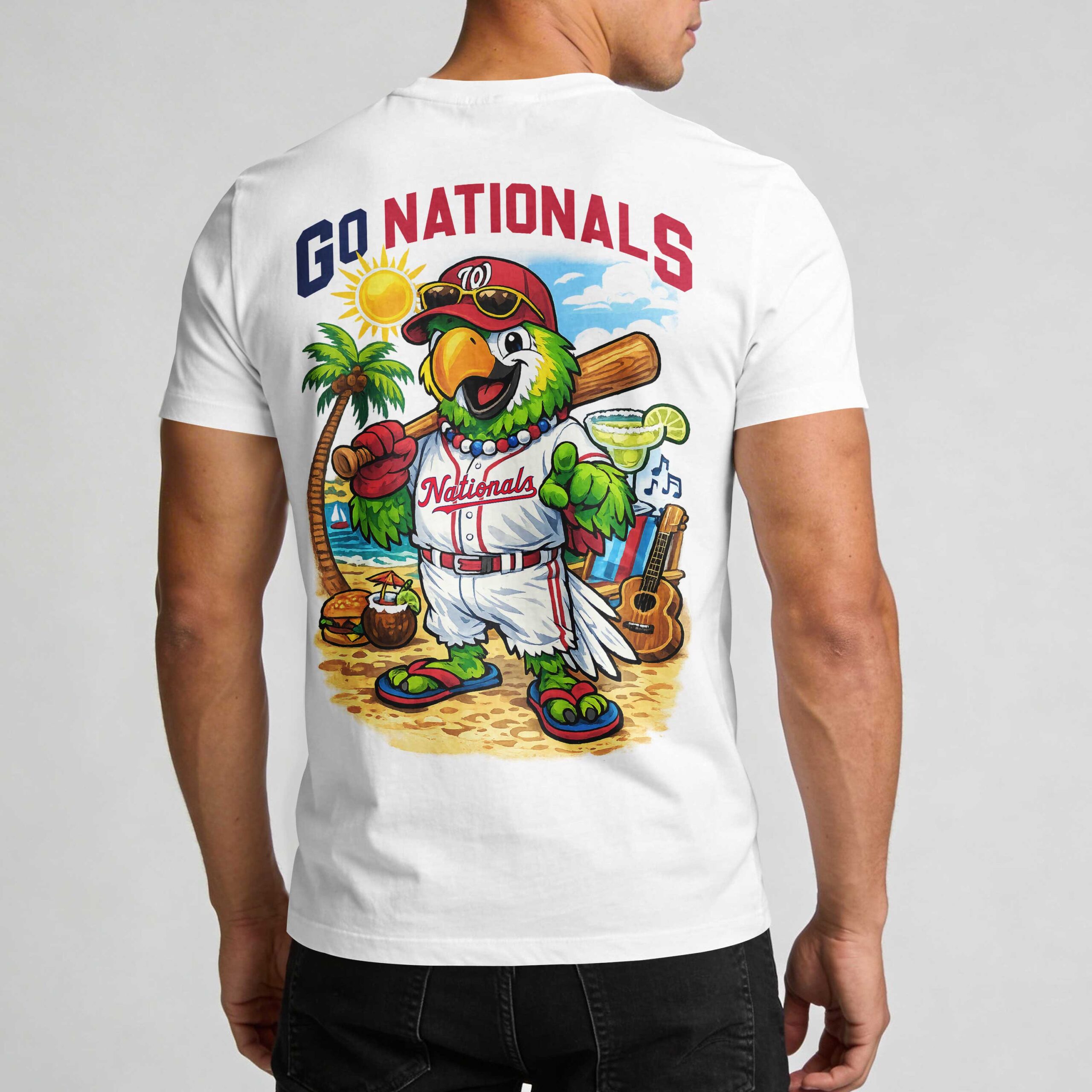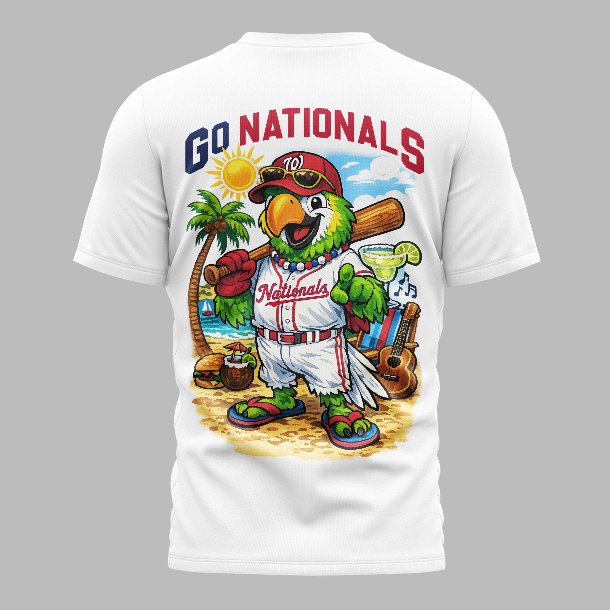 Washington Nationals USA 250 Independence Baseball Fan T-Shirt Show off your Washington Nationals pride with a unique, festive twist! This shirt combines your love for the team with a laid-back celebratory spirit, perfect for any dedicated fan. Whether you’re honoring a national milestone or hitting the stands, this apparel brings high energy and unwavering D.C. support to every single inning. The design features bold WASHINGTON NATIONALS text on the front, complemented by a Jimmy Buffett-inspired logo. The back truly shines with a vibrant parrot mascot in a full team uniform, set against a tropical beach scene. Detailed with palm trees, a guitar, and a baseball bat, this graphic masterfully blends team spirit with a fun, summer vibe. Ideal for game days at the ballpark, summer celebrations, or casual fan gatherings, this shirt is a must-have for every D.C. enthusiast. It’s a stylish way to represent your team from the first pitch to the final out.